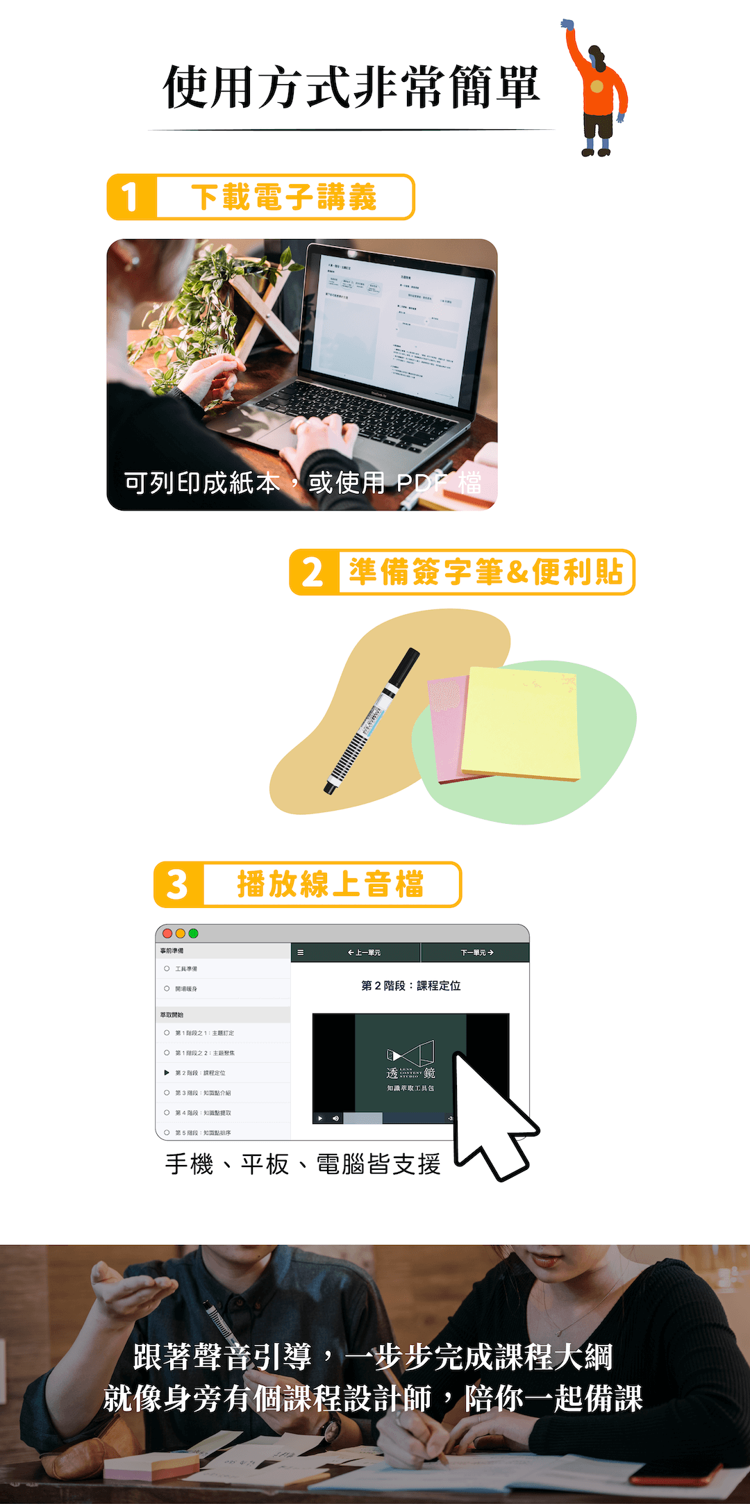 為講師而生的線上課程規劃工具,透過 5 階段的語音引導與講義,讓講師在任何時間、任何地點,僅需 3 小時即可完成課程規劃!